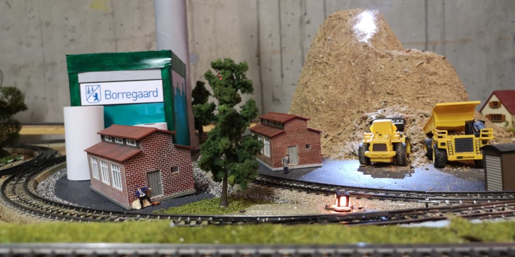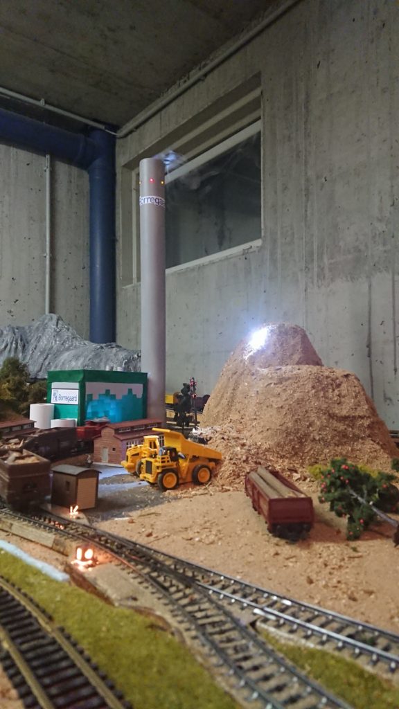 Der bereits fertiggestellte Rauchfang der Papierfabrik wurde nun um entsprechende Fabriksgebäude ergänzt und beleuchtet.